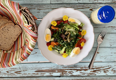 Mittwoch Mittag gab es einen bunten Salatteller mit Joghurtdressing, gekochtem Ei, Knoblauchcroutons aus Roggenvollkornbrot und dem ersten Bärlauch.