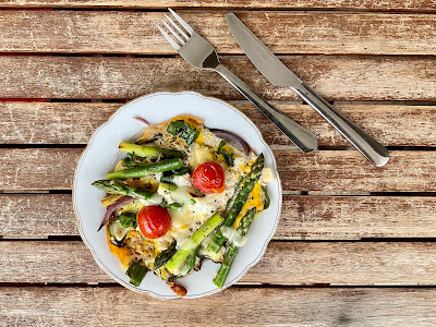 - Omelett mit grünem Spargel, Cocktailtomaten, Pimientos de Padrón und Käse. Köstlich!